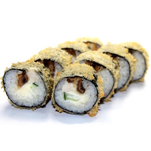 Горячий ролл микс, лосось, угорь, слывочный сыр,огурец, масаго, кляр, панировочные сухари. Вес: 220