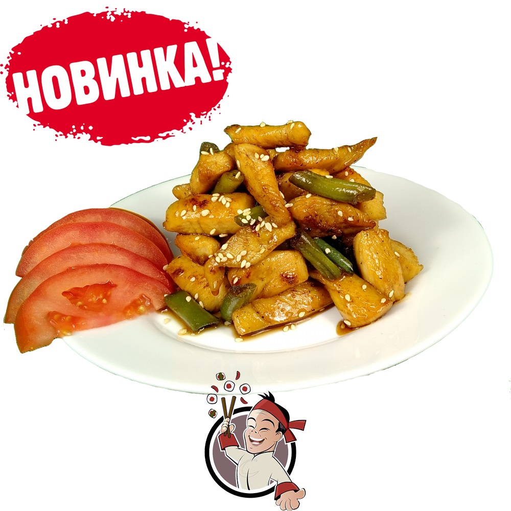 Состав: соус теряки, куриный грудка , фасоль, свежий томат , кунжут, рис. Вес - 300 г